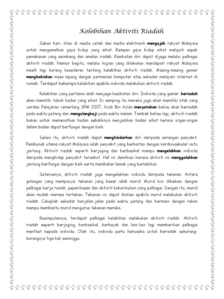 Kebaikan Beriadah from imgv2-1-f.scribdassets.com Semoga melalui contoh karangan tersebut dapat membantu anda dalam memahami karangan narasi. Selain itu, kepentingan aktiviti rekreasi adalah melapangkan minda dan fikiran masyarakat. Dengan itu, risiko kita untuk mendapat penyakit. Penutup faedah bersukanpendahuluan :bersukan merupakan aktiviti riadah yang dapat mengeluarkan peluh daripada tubuh badan kita. Salah satu kepentingan aktiviti rekreasi termasuklah mengeratkan hubungan silaturahim. Seterusnya, kepentingan kajian serta skop kajian juga turut dinyatakan dalam bahagian. Dengan melakukan aktiviti riadah bersama ahli keluarga, hubungan antara ahli keluarga dapat dieratkan dan dapat mengenali dengan lebih mendalam lagi antara satu sama lain. Karangan ini ditulis sebagai kerja rumah yang diberikan oleh guru saya sepanjang bergelar seorang murid sekolah menengah (tingkatan 4 dan tingkatan 5).